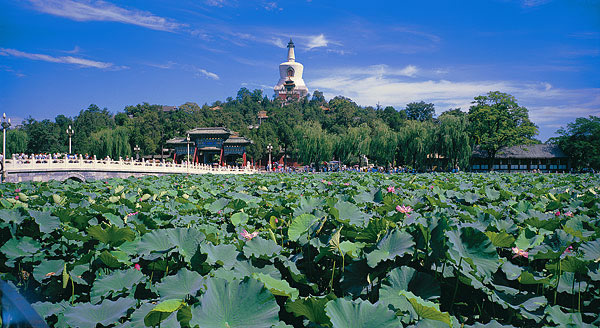 北海公园全园以北海为中心,面积达到0.69平方公里(其中水面约0.39平方公里)。湖口琼华岛上建的藏式白塔为全园标志。北海北岸是几组宗教建筑,有小西天、大西天、阐福寺,西天梵境等,还有五色琉璃镶砌的九龙壁,两面各有蟠龙9条,戏珠于波涛云际,造型生动,色彩明快。园内还保存有文物铁影壁、一座16面多角形塔式石幢、495方历代著名书法家真迹、万岁山团城和承光殿玉佛等。