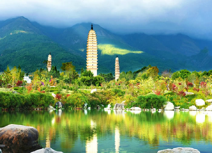 崇圣寺三塔,距离下关14千米,位于云南省大理以北1.5千米苍山应乐峰下,背靠苍山,面临洱海,三塔由一大二小三座佛塔组成,呈鼎立之态,远远望去,雄浑壮丽,是苍洱胜景之一。