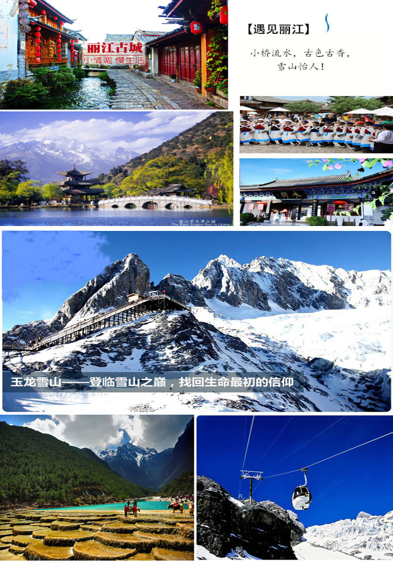 丽江景区:丽江古城、四方街、大水车、纳西壁画、大研镇、(A线玉龙雪山、云杉坪、甘海子、白水河+蓝月谷)或(B线束河古镇、黑龙潭、东巴大峡谷,雪山骑马场)