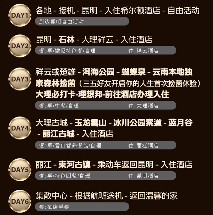 特色餐饮 | 全程安排特色餐,楚雄野生菌火锅、大理白族风味小吃、丽江土锅鸡!让您充分品味舌尖上的云南美食! |